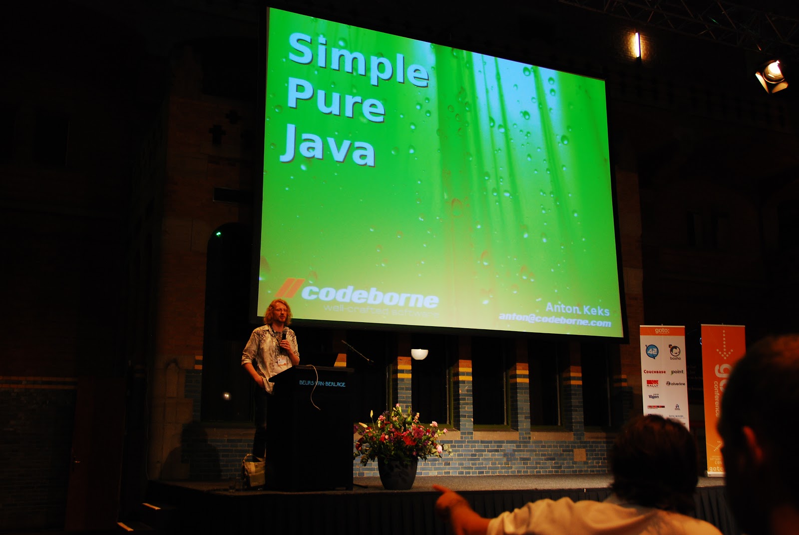 I was very pleased to see Anton Keks kick off the Java track with a talk to pull us developers back to reality. Instead of running off to find a shiny new language to fix our problems, we can toss away overblown frameworks and enterprise architecture and write nice, simple Java. We can even go against basic conventions to make our code more terse and readable. While I’m not sold on all suggestions (e.g. not using curly braces for single-line if statements) I’m totally behind the theory, and it led nicely into my Disruptor presentation.